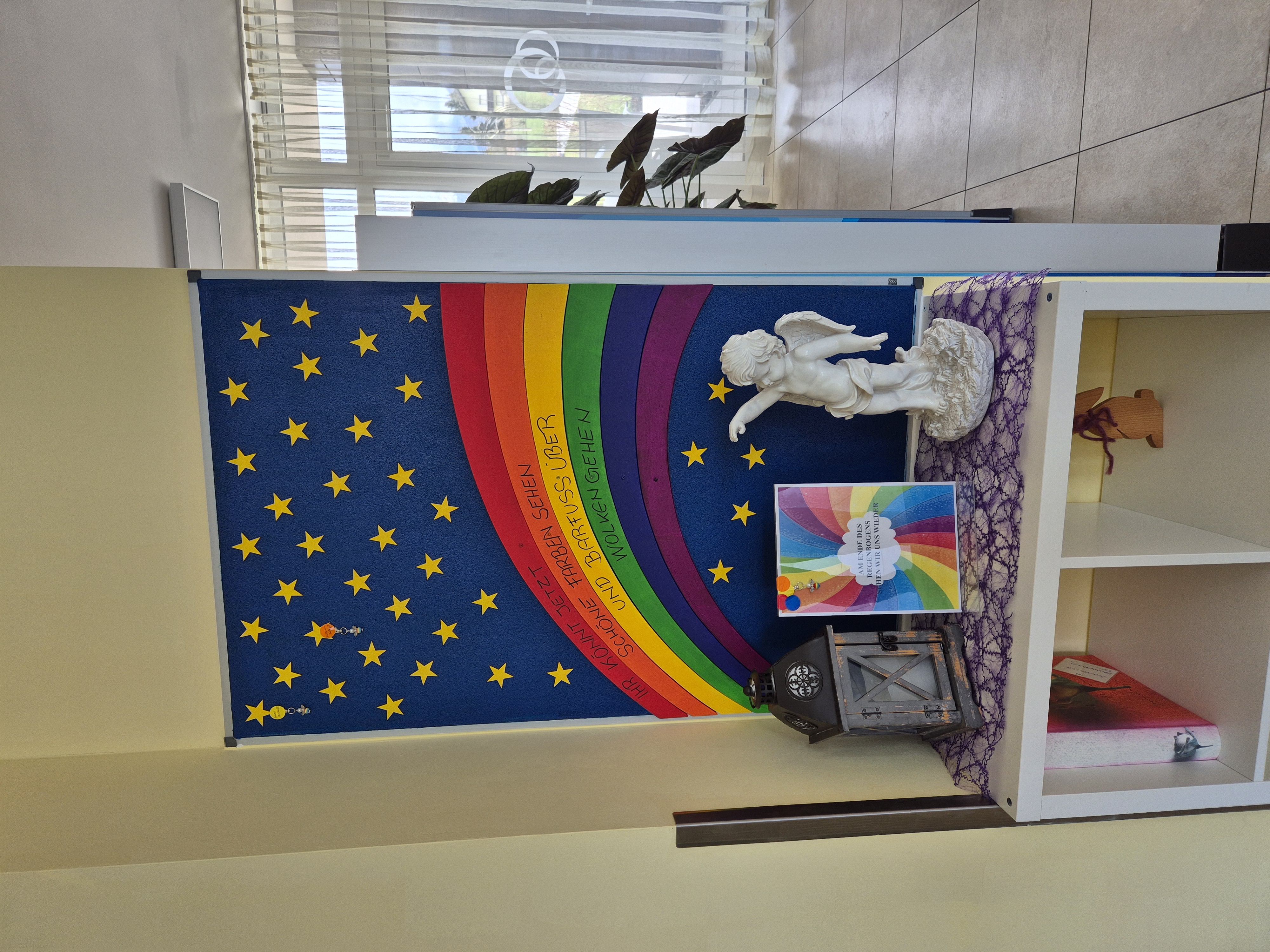 Seit kurzem gibt es im SeneCura Pflegeheim Lurnfeld eine neue Gedenkstätte für die Verstobenen des Hauses. Die Aktivierungsmitarbeiter:innen und der Haustechniker des SeneCura Lurnfeld haben diesen neuen Platz liebevoll und wirklich schön gestaltet. Es wurde eigens ein Regenbogen und Sterne aus Holz ausgeschnitten und bemalt. Auf jeden Stern kommt dann ein Engelsanhänger mit dem Namen des Verstorbenen. „Eine wirklich sehr schöne Erinnerungsstätte“, ist man sich einig.
